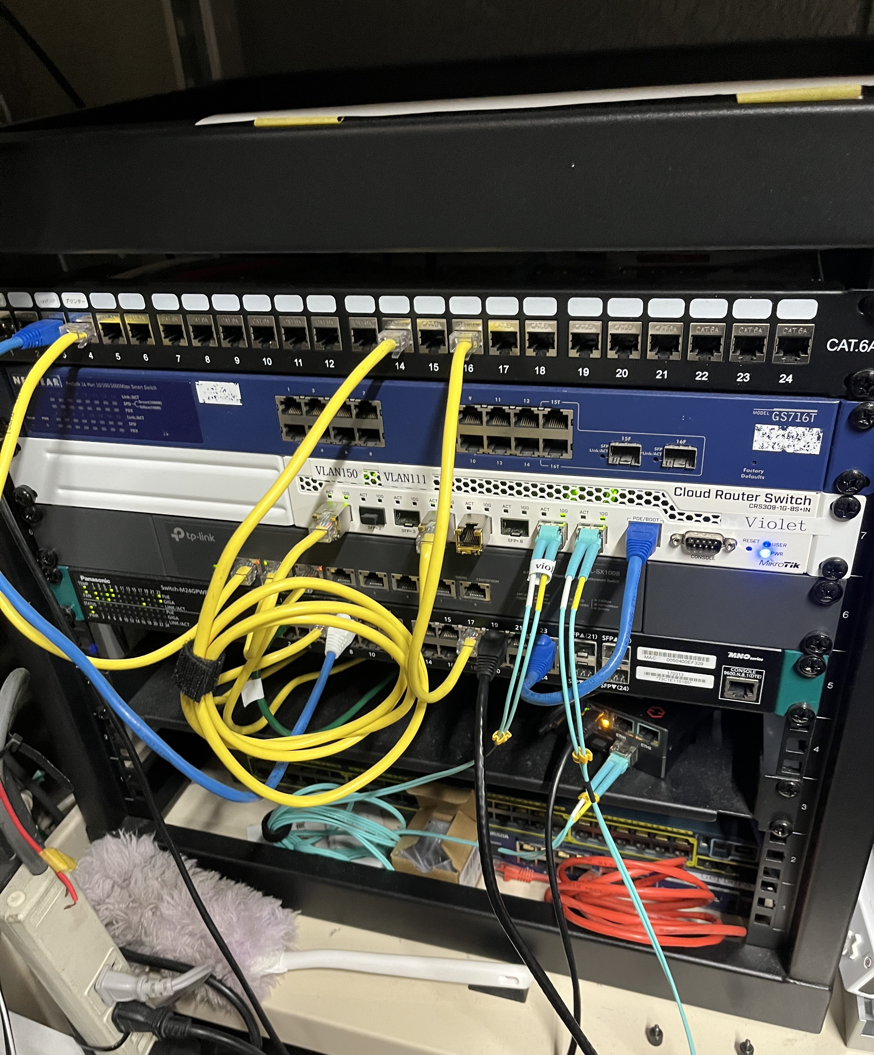 ラックマウントされた10G対応のL2スイッチ、PoE対応のL2スイッチ、Vyosを用いたソフトウェアルータで構成されている。